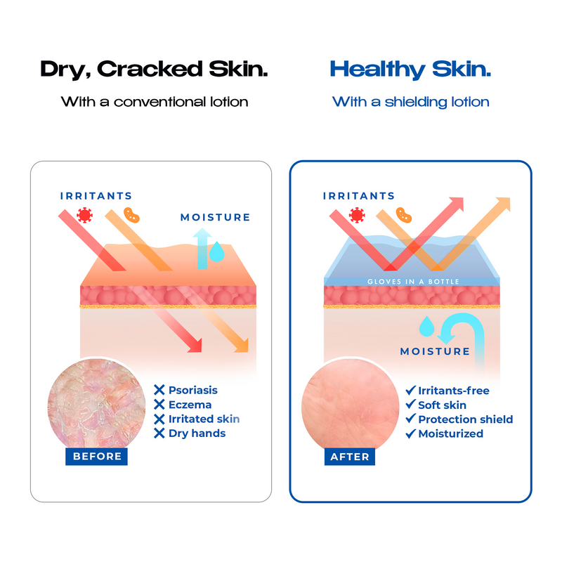 Gloves In A Bottle is different. One application of this innovative shielding lotion forms a breathable, invisible barrier that acts as a protective shield. It helps to restore severely dry skin by repelling irritants such as chemicals, toxins, water, and sunlight, while locking in natural moisture. This unique approach, combined with regular use, provides your skin with the protection and time it needs to heal, resulting in a healthier, more resilient appearance.