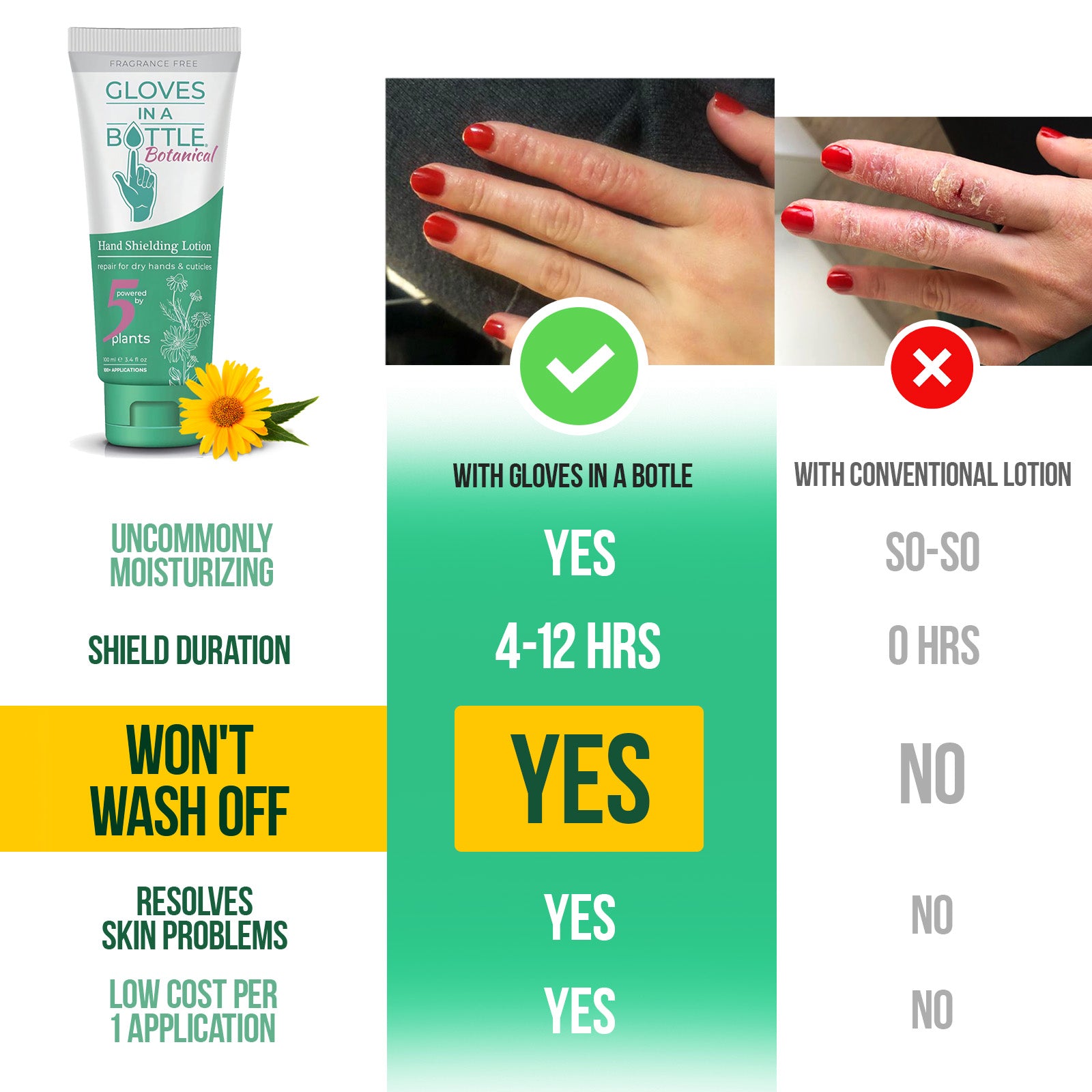 Gloves In A Bottle is different. One application of this innovative shielding lotion forms a breathable, invisible barrier that acts as a protective shield. It helps to restore severely dry skin by repelling irritants such as chemicals, toxins, water, and sunlight, while locking in natural moisture. This unique approach, combined with regular use, provides your skin with the protection and time it needs to heal, resulting in a healthier, more resilient appearance.