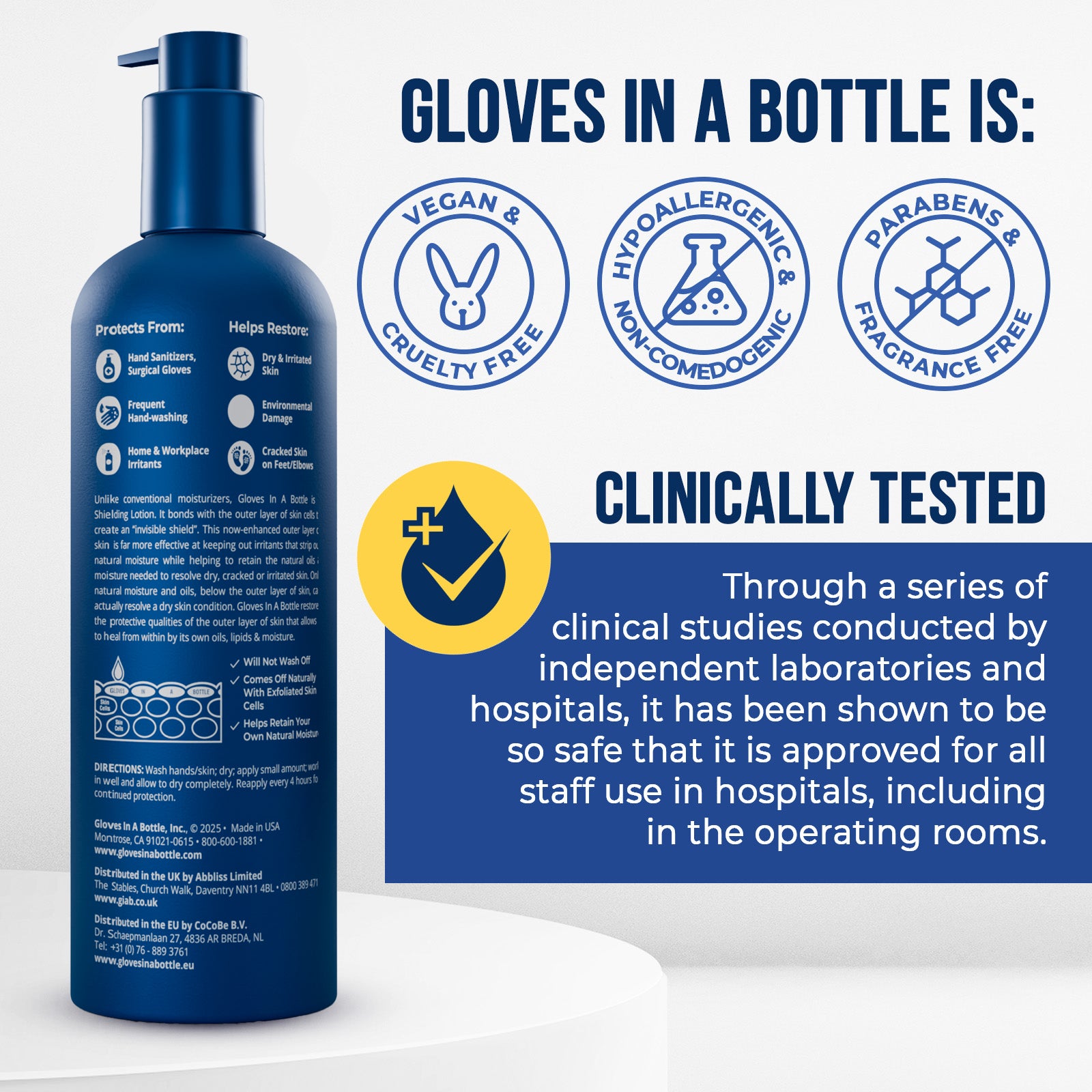 Gloves In A Bottle is vegan, dermatology tested and prescribed, hypoallergenic, non-comedogenic (will not clog pores), cruelty free, and every ingredient is on the FDA’s most safe list. Through a series of clinical studies conducted by independent laboratories and hospitals, Gloves In A Bottle has been shown to be so safe that it is approved for all staff use in hospitals, even in the operating rooms.